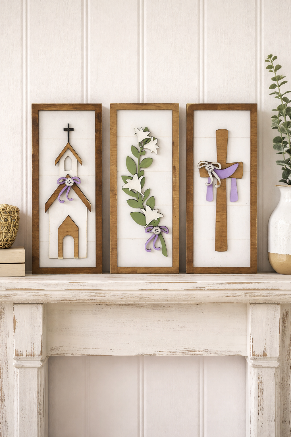 The Risen mantle set includes three pieces— a church, a cross, and a floral arrangement—each measuring 12x3 inches. This Easter decoration enhances your mantle with a thoughtful design that reflects the season's significance, providing a tasteful and meaningful focal point for your home decor.